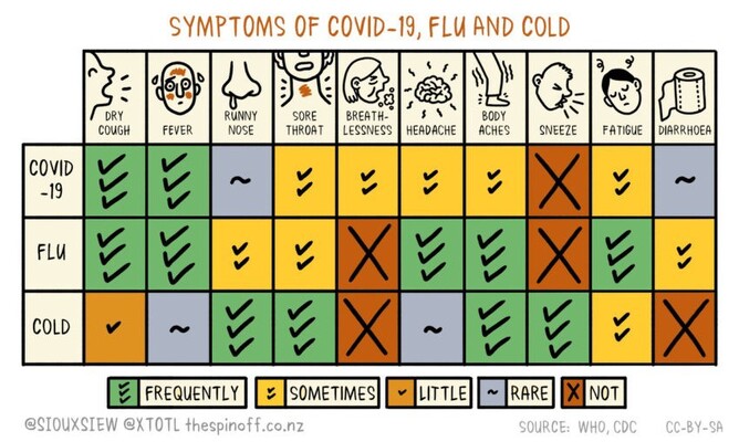 A diagram has been developed by Dr Siouxsie Wiles to assist you when considering symptoms. What it tells us is: